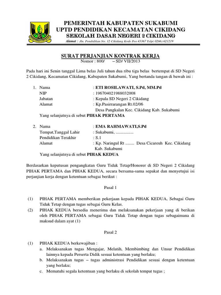 Surat Perjanjian Kontrak Kerja Guru Karyawan Sekolah Antapedia Com